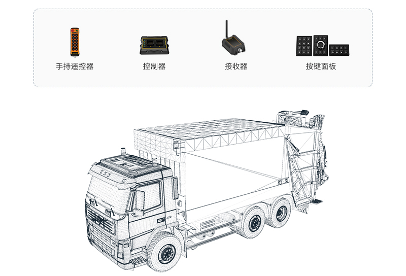垃圾压缩车电控系统可实现远距离控制,支持按键面板和发射器互锁,避免逻辑混乱,造成误操作。指示灯实时指示状态、显示报警,采用CAN总线通讯,节省线束,大大提升了智能化程度。